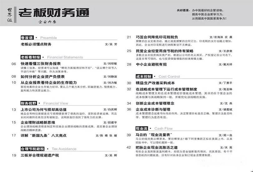 主要栏目有:老板看财报FinancialStatements,财务视野FinancialView,合理节税避税TaxAvoidance,成本控制CostControl,现金流CashFlow,风险管控RiskControl等。